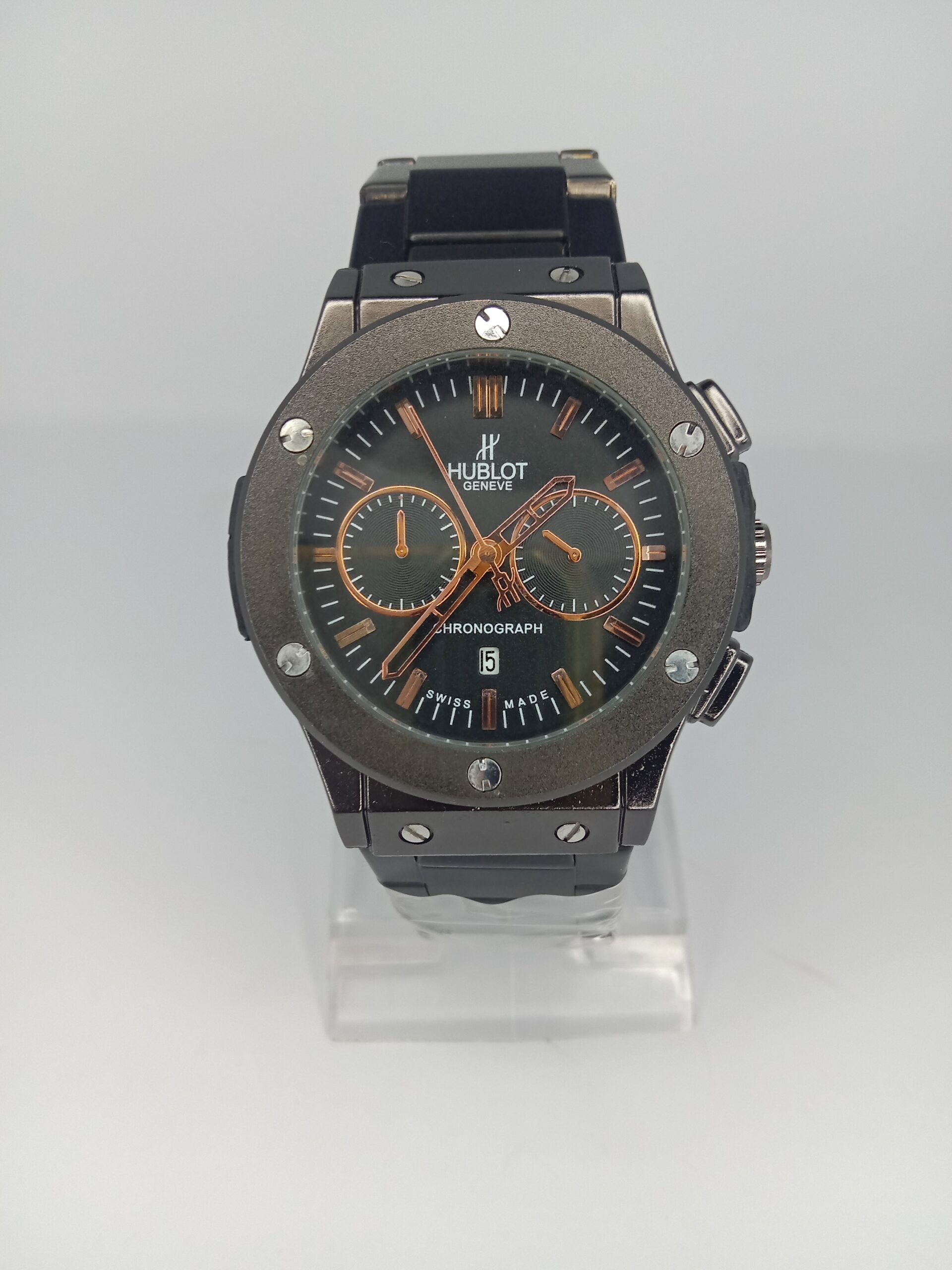 Experience luxury and precision with this Hublot timepiece. Featuring a sleek black dial complemented by striking copper pins and nuggets, this watch effortlessly combines bold design with refined elegance. The contrast between the deep black base and the warm copper details creates a captivating look that stands out on any wrist. Crafted for comfort and durability, it’s the perfect accessory for those who appreciate sophistication with a modern edge. Ideal for both formal occasions and everyday wear, this Hublot watch makes a statement without saying a word.